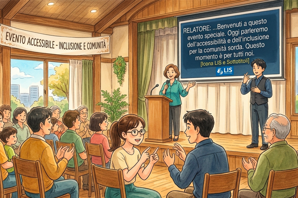 Come organizzare eventi accessibili: luci, posizionamento interpreti LIS, PIP su schermo, sottotitoli e regia audio/video.